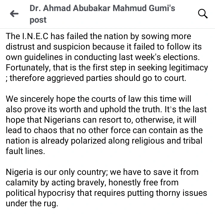 A well known Nigerian Islamic scholar from the north, Sheikh Ahmad Gumi, took to his social media platform in the early hours of today to comment about the outcome of the recently concluded presidential election.