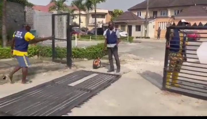 Above are pictures in App save up to 80% data.(Caption): Some street gates being pulled down in Lekki on Saturday.