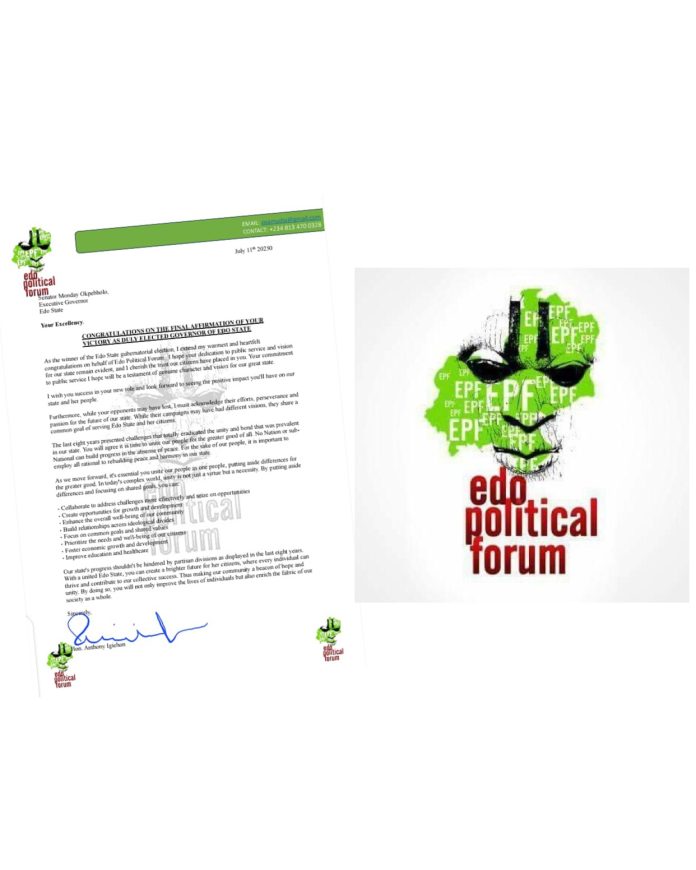 The Edo Political Forum has extended warm congratulations to Senator Monday Okpebholo on the final affirmation of his victory as the duly elected Governor of Edo State. In an official congratulatory message signed by Hon. Anthony Igiehon, the group expressed hope that Okpebholo’s tenure would be marked by commitment to public service, visionary leadership, and the collective advancement of the state.
