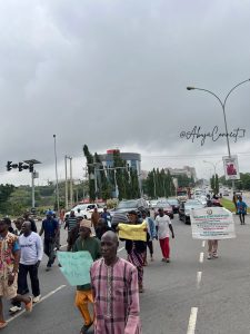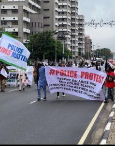 The demonstration, which drew dozens of supporters and rights advocates, began at the Unity Fountain and proceeded toward the National Assembly complex under tight security supervision. Protesters carried placards with inscriptions such as “Respect Police Lives Too,” “Retired But Not Forgotten,” and “Fair Pay for Police Now!”