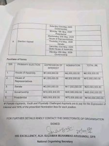 The schedule, signed by the party’s National Organising Secretary, Sulaiman Muhammad Argungu, provides detailed timelines for critical stages such as screening of aspirants, appeals, and the conduct of primary elections. It also includes directives regarding the sale of nomination and expression of interest forms for prospective candidates.